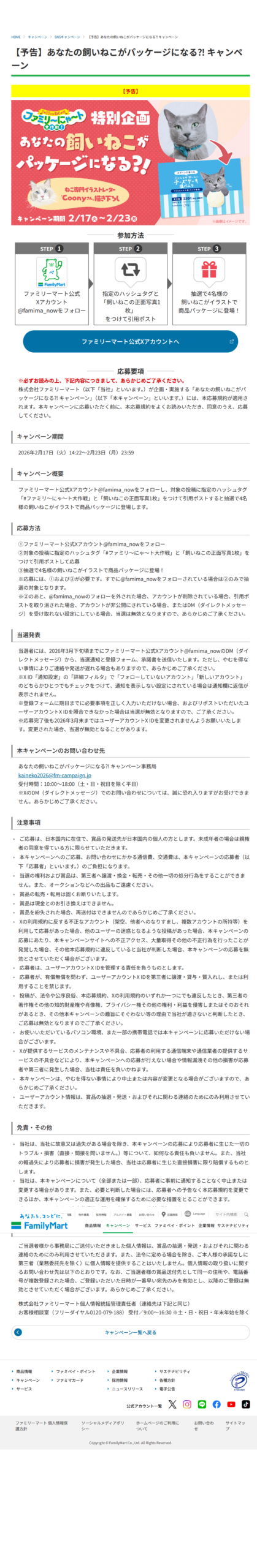 ファミリーマート 【予告】あなたの飼いねこがパッケージになる⁈ キャンペーン ファミリーマート X Facebook はてブ Pocket LINE コピー 2026.02.07 otoku-family.site/archives/1224/