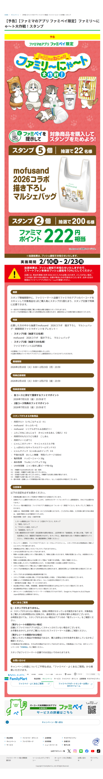 ファミリーマート 【予告】【ファミマのアプリ ファミペイ限定】ファミリ~にゃ~ト大作戦!スタンプ ファミリーマート X Facebook はてブ Pocket LINE コピー 2026.02.07 otoku-family.site/archives/1232/