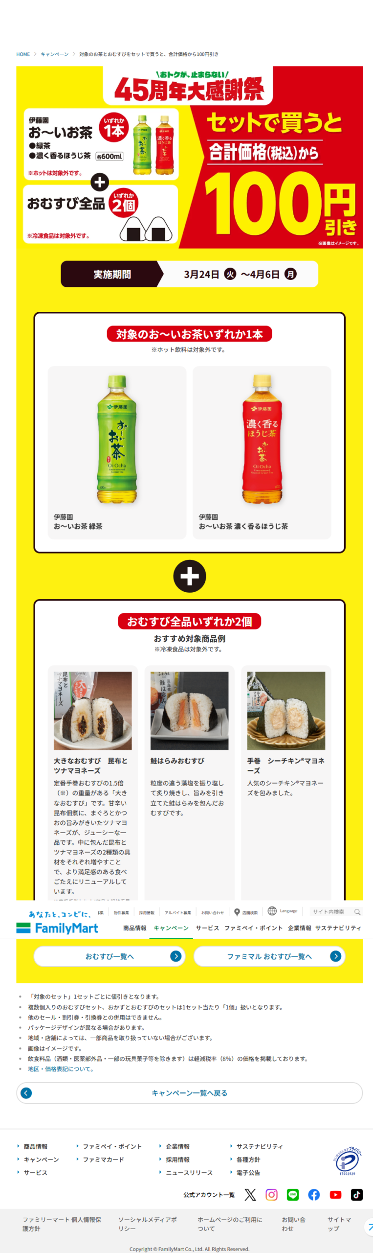 ファミリーマート 対象のお茶とおむすびをセットで買うと、合計価格から100円引き ファミリーマート X Facebook はてブ Pocket LINE コピー 2026.03.25 #ファミリーマート otoku-family.site/archives/1690/