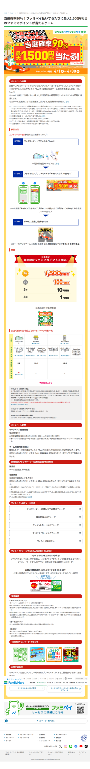 ファミリーマート 当選確率90%!ファミペイ払いするたびに最大1,500円相当のファミマポイントが当たるゲーム ファミリーマート X Facebook はてブ Pocket LINE コピー 2026.04.01 #ファミリーマート otoku-family.site/archives/1774/